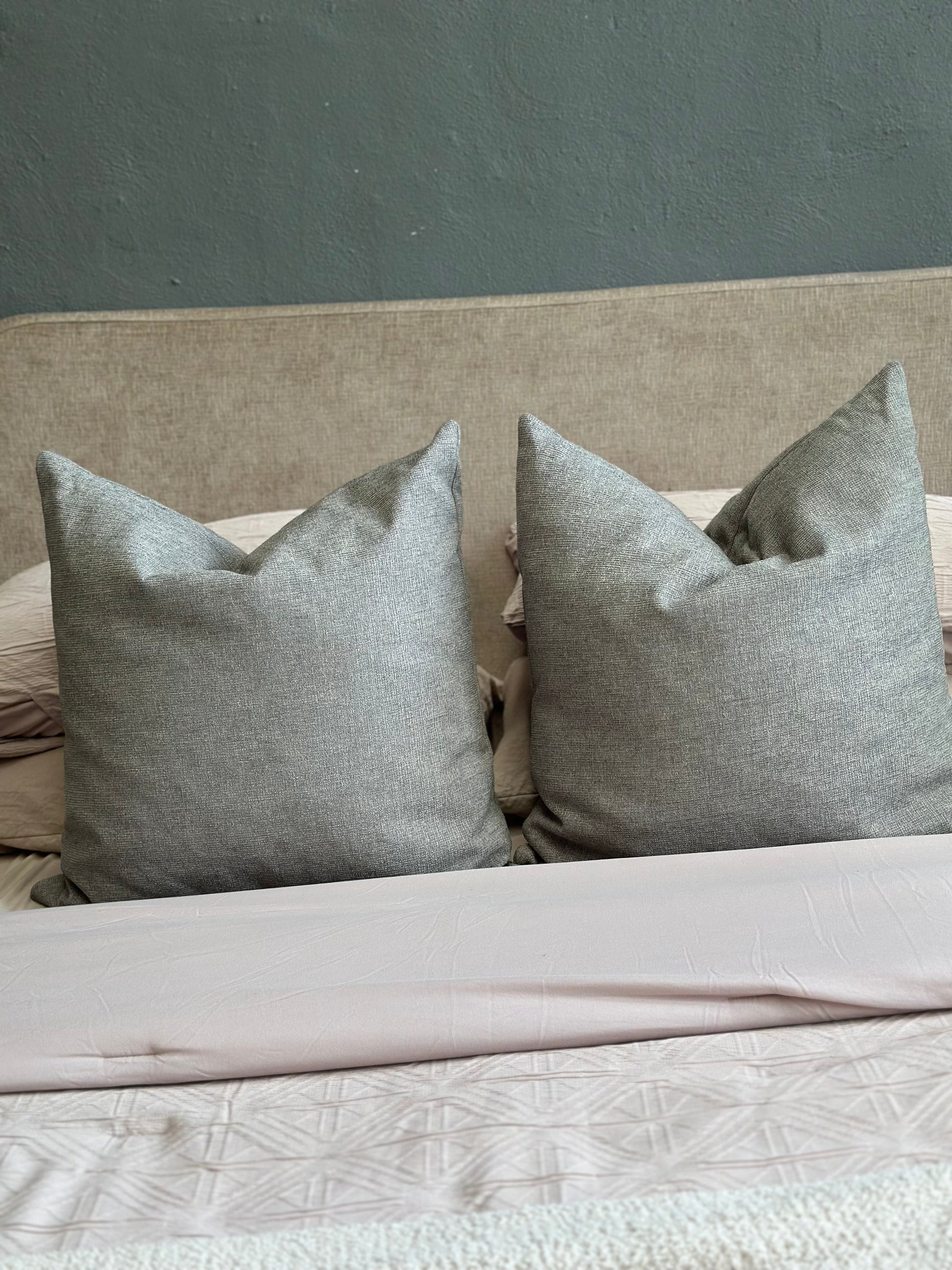 Hermosa funda color gris, tela gruesa y ligeramente aspera.Es el elemento perfecto para darle un toque moderno, diferente y elegante a tu espacio.