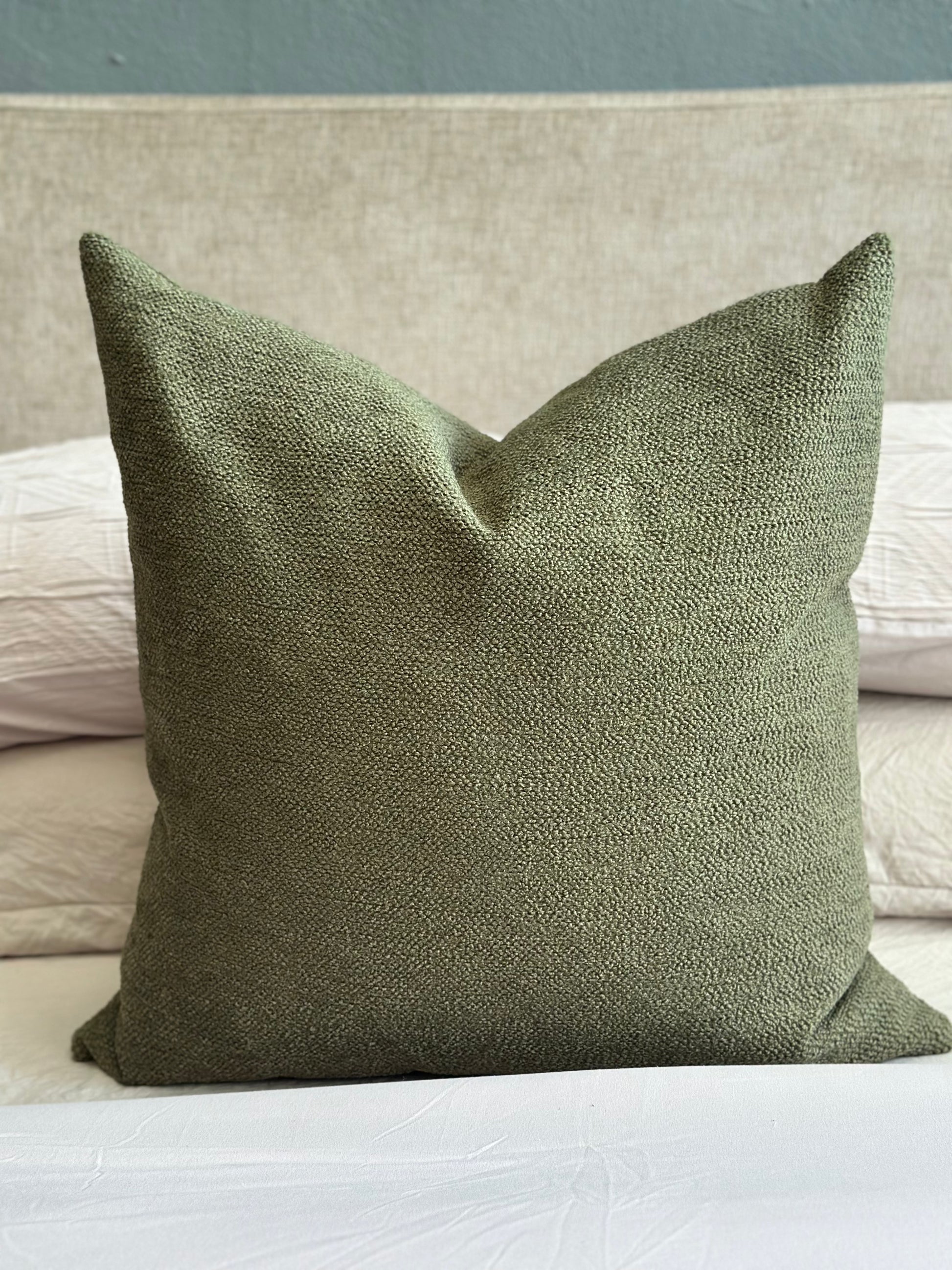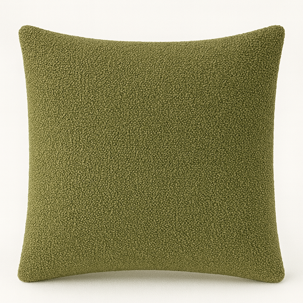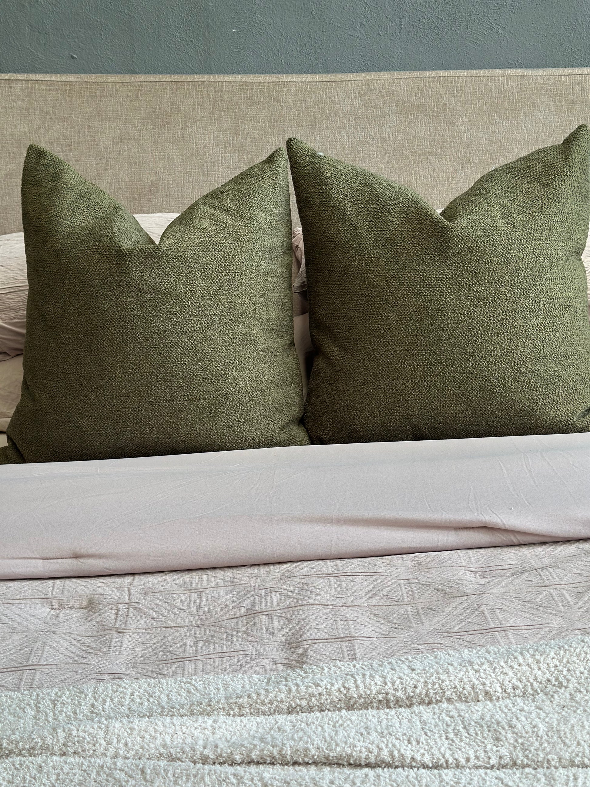 Hermosa funda color olivo, tela gruesa y ligeramente aspera.Es el elemento perfecto para darle un toque moderno, diferente y elegante a tu espacio.